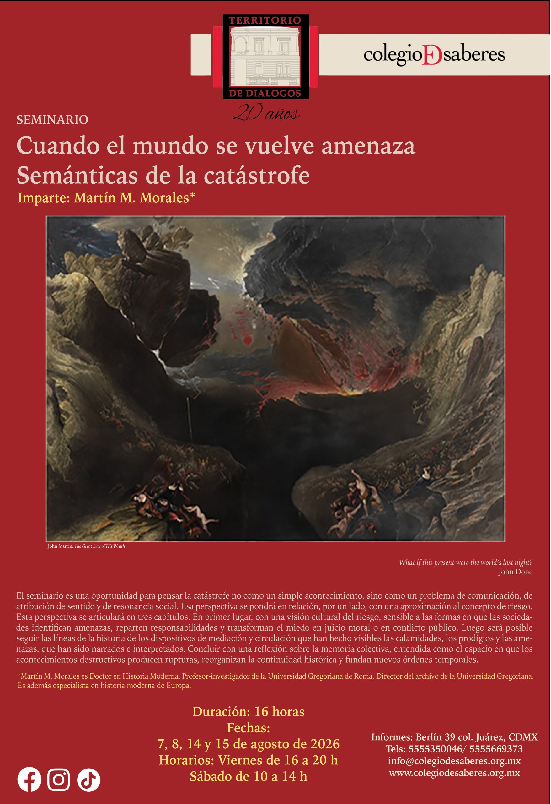 El seminario es una oportunidad para pensar la catástrofe no como un simple acontecimiento, sino como un problema de comunicación, de atribución de sentido y de resonancia social. Esa perspectiva se pondrá en relación, por un lado, con una aproximación al concepto de riesgo. Esta perspectiva se articulará en tres capítulos. En primer lugar, con una visión cultural del riesgo, sensible a las formas en que las sociedades identifican amenazas, reparten responsabilidades y transforman el miedo en juicio moral o en conflicto público. Luego será posible seguir las líneas de la historia de los dispositivos de mediación y circulación que han hecho visibles las calamidades, los prodigios y las amenazas, que han sido narrados e interpretados. Concluir con una reflexión sobre la memoria colectiva, entendida como el espacio en que los acontecimientos destructivos producen rupturas, reorganizan la continuidad histórica y fundan nuevos órdenes temporales.